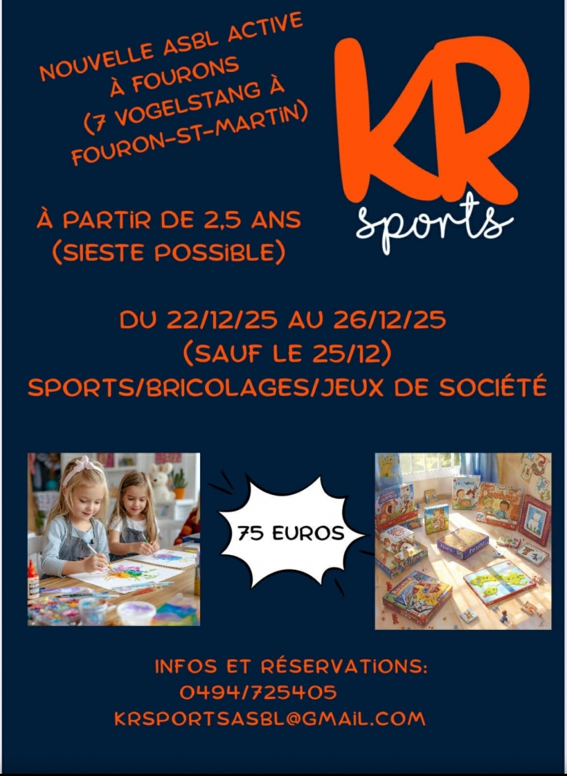 Bonne nouvelle ! L'ASBL KR Sports organise un Stage de Noël à Fouron-Saint-Martin pour les enfants à partir de 2 ans et demi, avec sieste possible.