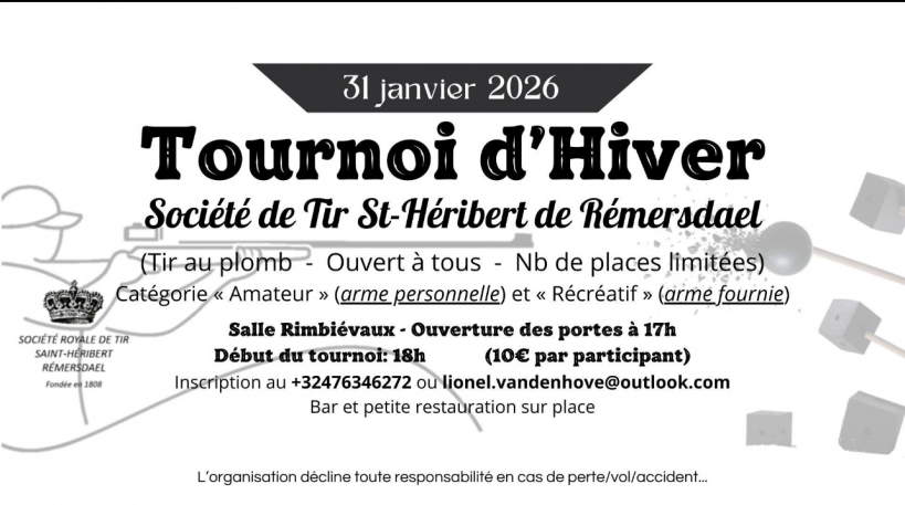 Amateurs de tir et de challenge, la Société Royale de Tir St-Héribert de Rémersdael vous convie à son "Tournoi d’Hiver", le 31 janvier 2026 à la Salle Rimbiévaux.
