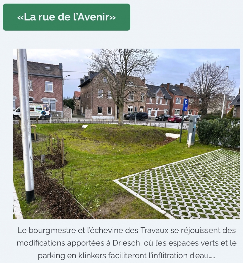 L'Échevine des Travaux, Yolanda Daems (Voerbelangen) explique que «nous appelons désormais Driesch la rue de l’Avenir (NDLR: belle promotion pour le journal qui m’a employé pendant 43 ans… et (air connu), ne m’a pas rémunéré à mon goût). Des surfaces dures ont fait place à des zones vertes, où l’eau s’infiltrer. On a aussi créé des places de parking avec des klinkers, et les approvisionnnements en eau, en électricité et pour le Net ont été améliorées».